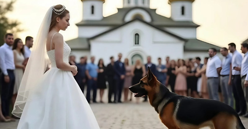At the wedding, the bride’s dog blocked the path.